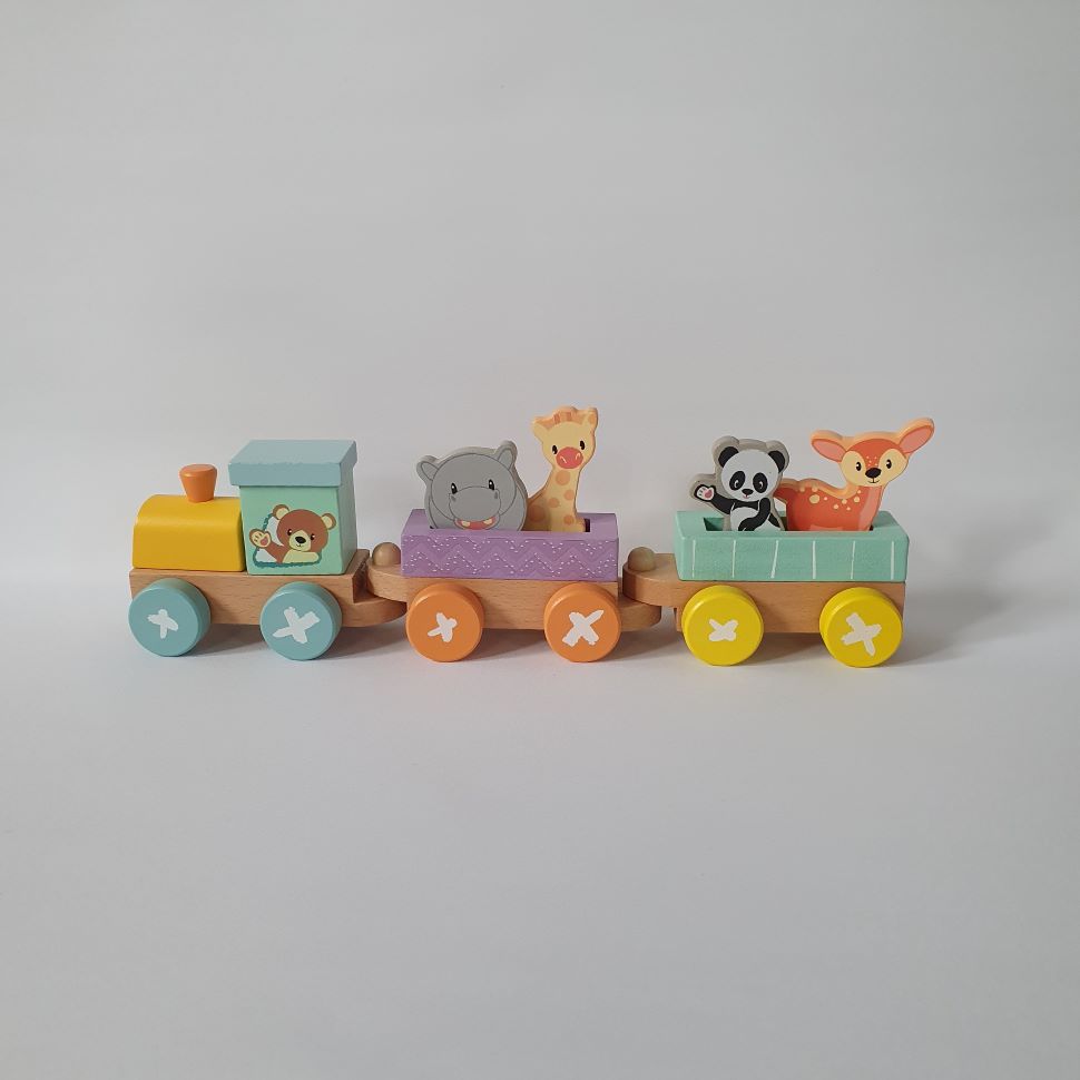 Superleuke houten trein van het merk Studio Circus met diertjes. Bij de trein zitten een nijlpaard, giraffe, panda en hertje.