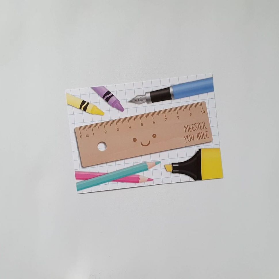 Een vrolijke kaart met de afbeelding van een liniaal met oogjes! Deze geef je natuurlijk aan je leuke meester!